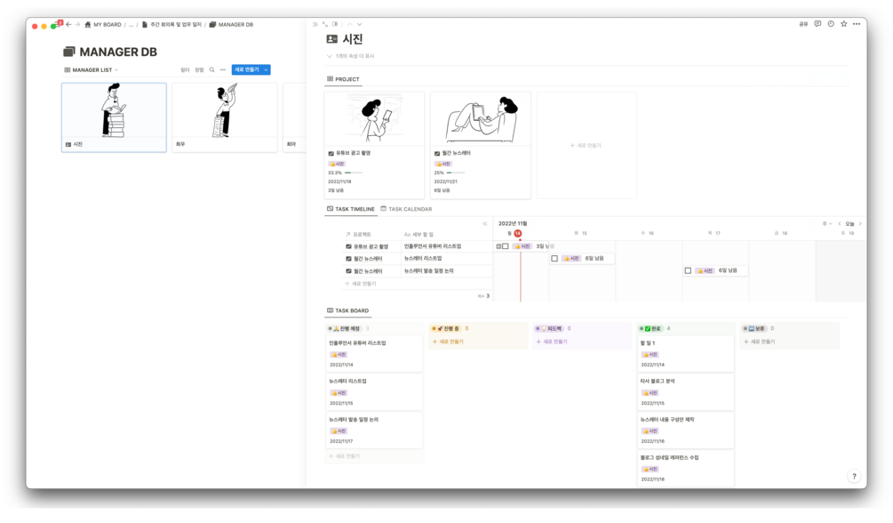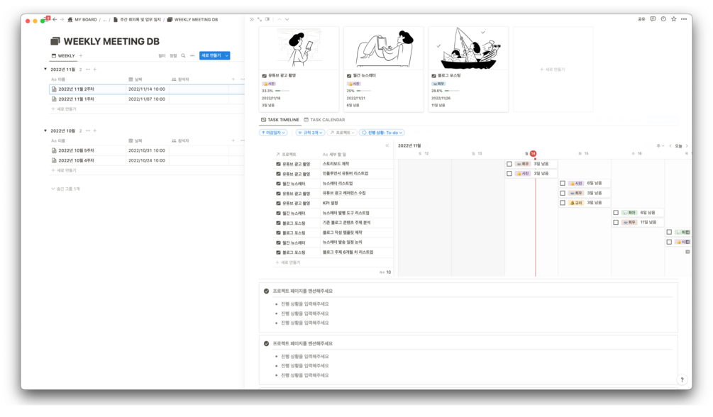1. 주간 회의록 템플릿을 통해 매주 월요일마다 새로운 프로젝트를 등록하고 연관 관계를 설정하여 효율적으로 관리하고 있습니다. 이를 통해 매일 완료율을 확인하며 꾸준히 목표를 달성하고 있습니다.