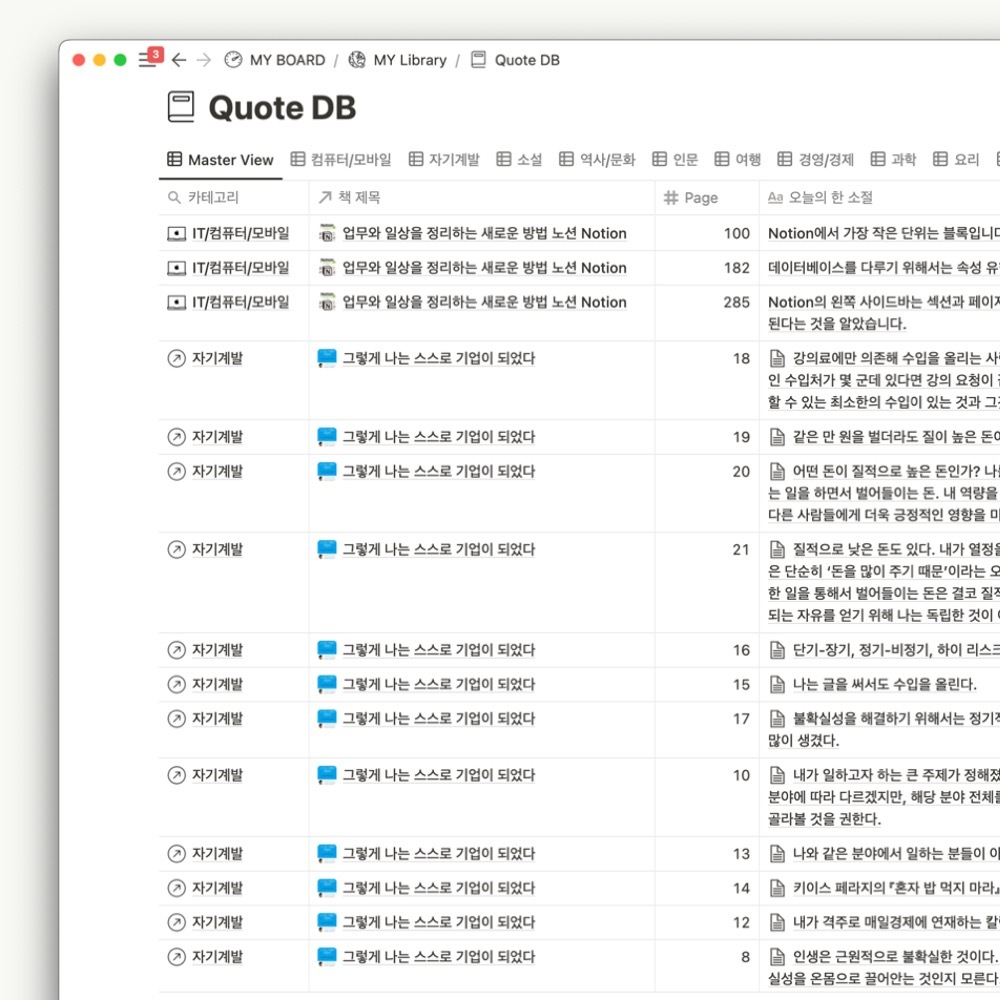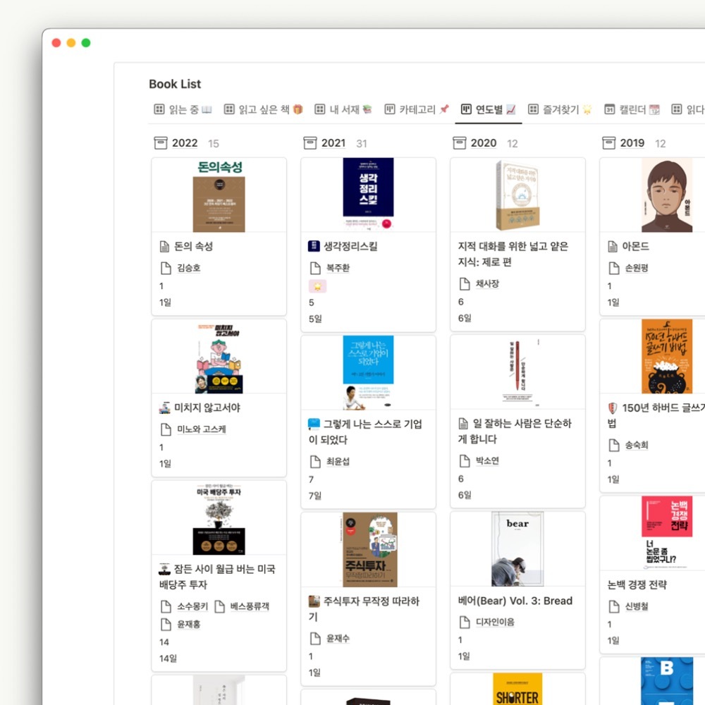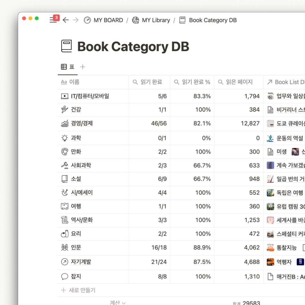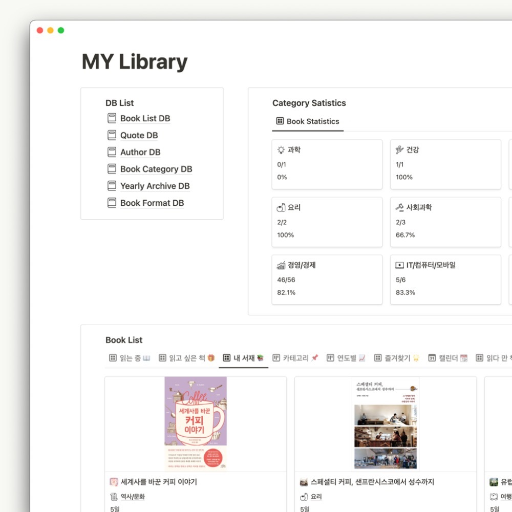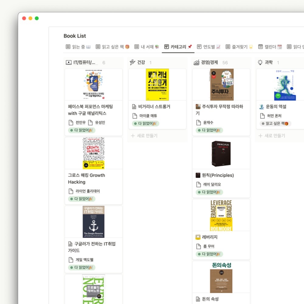 노션에 데이터베이스를 만들어서 카테고리별로 도서를 분류하고, 정리할 수 있습니다.