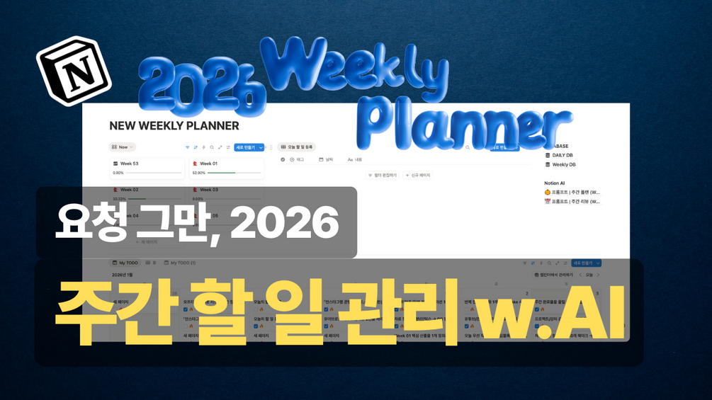 2025/12/30 : 2026 할 일 및 노션 AI 프롬프트 업데이트2024/12/21 : 2025 할 일 업데이트2024/06/08 : 복제 불가 문제 해결2023/08/06 : 2024년 Weekly Planner 업데이트2022/11/15 : 자주 묻는 질문 업데이트2022/11/04 : New Weekly Planner 출시New Weekly Planner ver2.0 노션 주간 할 일 관리 템플릿